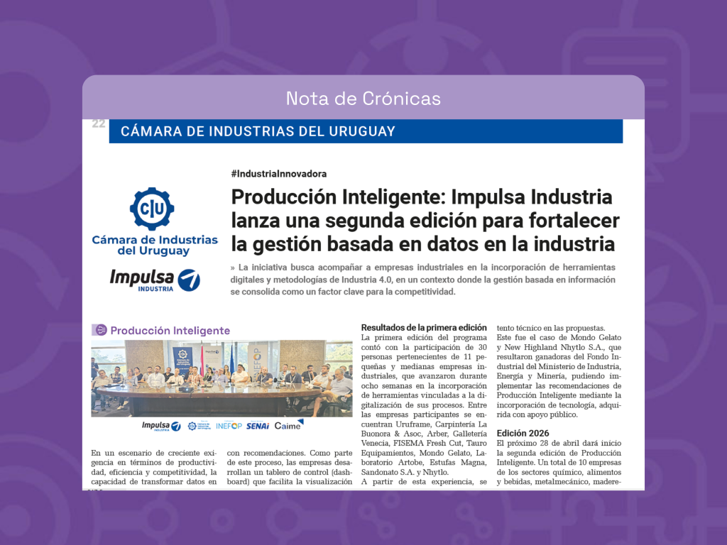Impulsa en los Medios Crónicas: Producción Inteligente: Impulsa Industria lanza una segunda edición para fortalecer la gestión basada en datos en la industria El medio Crónicas destacó la nueva edición de Producción Inteligente, una iniciativa de Impulsa Industria…Virginia Cantouabril 17, 2026